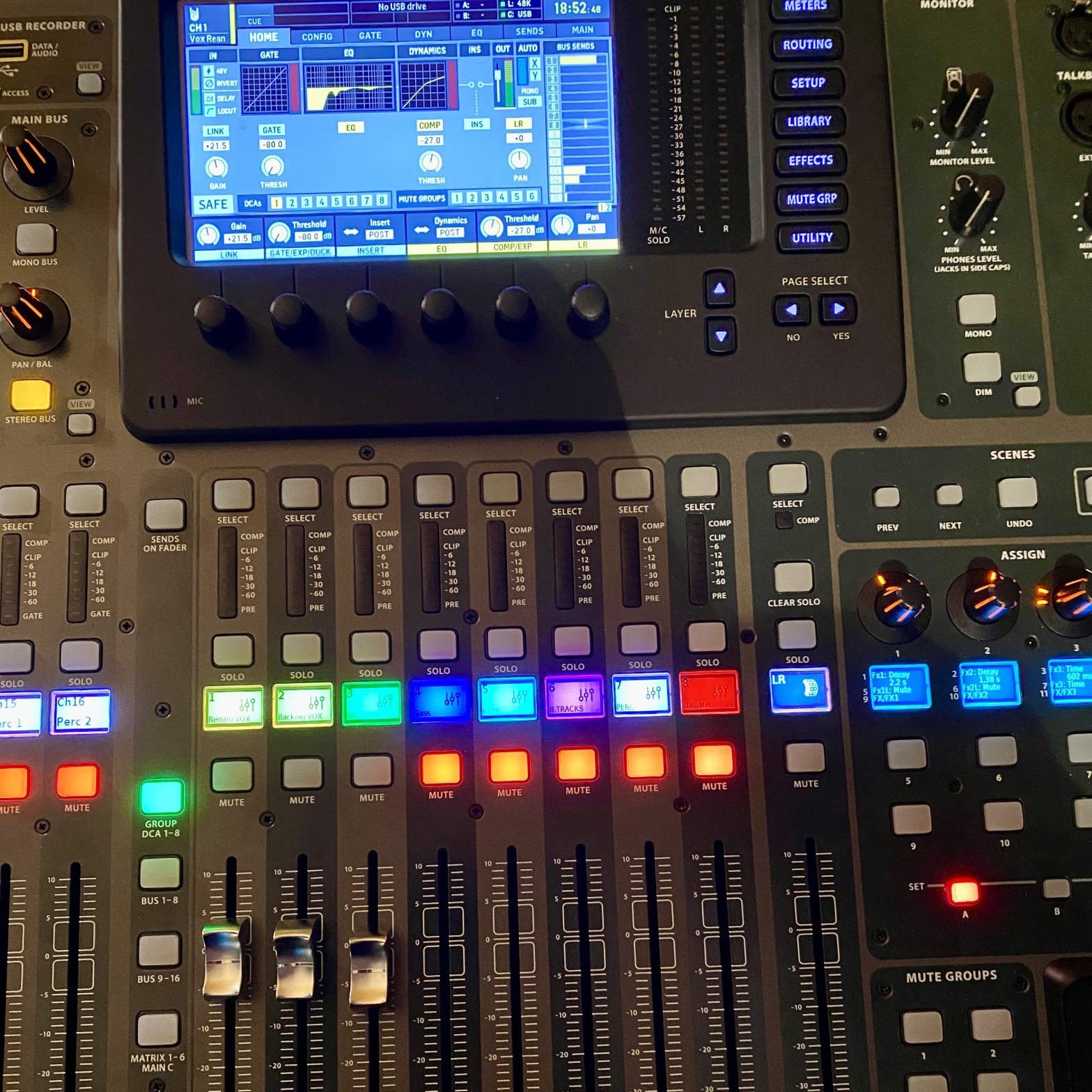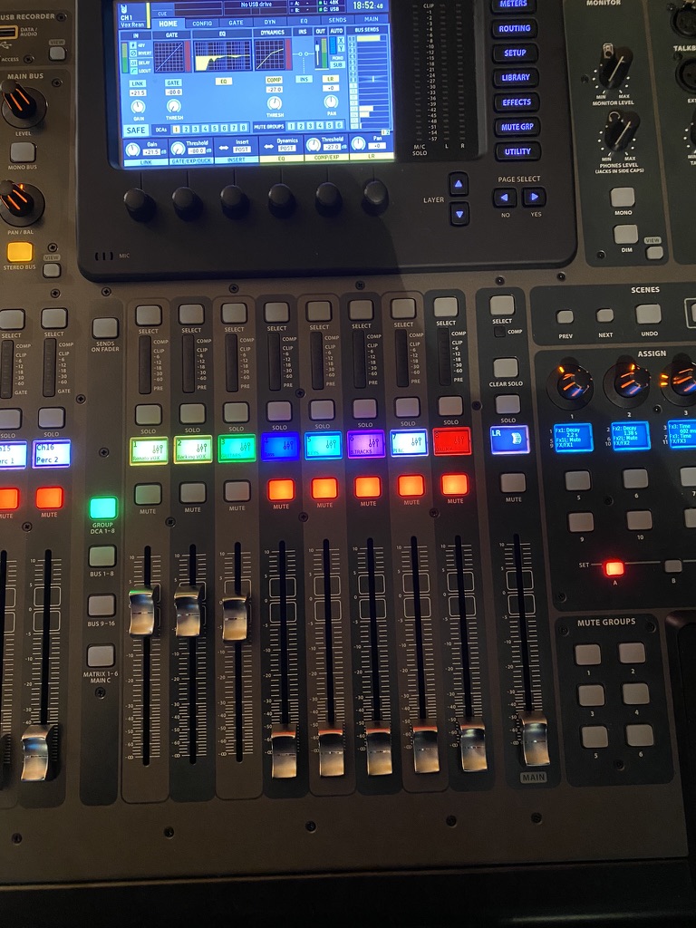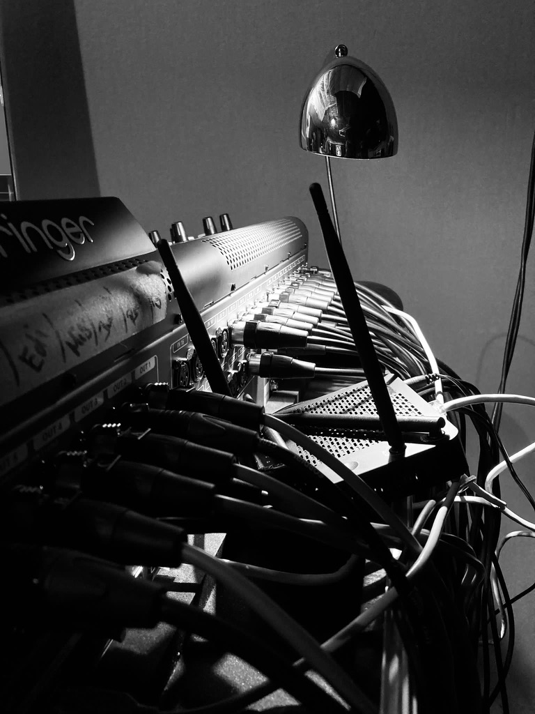 Herzstück unseres Setups ist ein Behringer X-32. Eine 40-Input, 25-Bus Digital Mixing Console mit 32 programmierbaren Midas Preamps, 25 motorisierten Faders,-Channel LCD’s, 32-Channel Audio Interface und iPad/iPhone* Remote Control für die individuelle Steuerung unsere In-Ear und Monitorkanäle.
